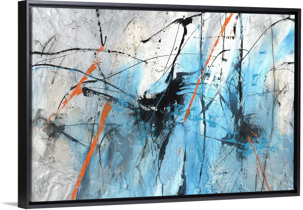 <p>Large abstract painting with busy lines of color in bright blue and orange with black and white mixed in on a silver background.</p>