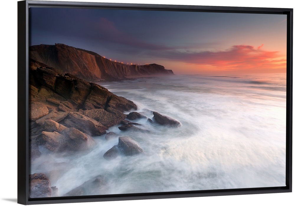 <p>Rocky ocean cliffs over the sea at sunset, Santa Cruz, Portugal.</p>