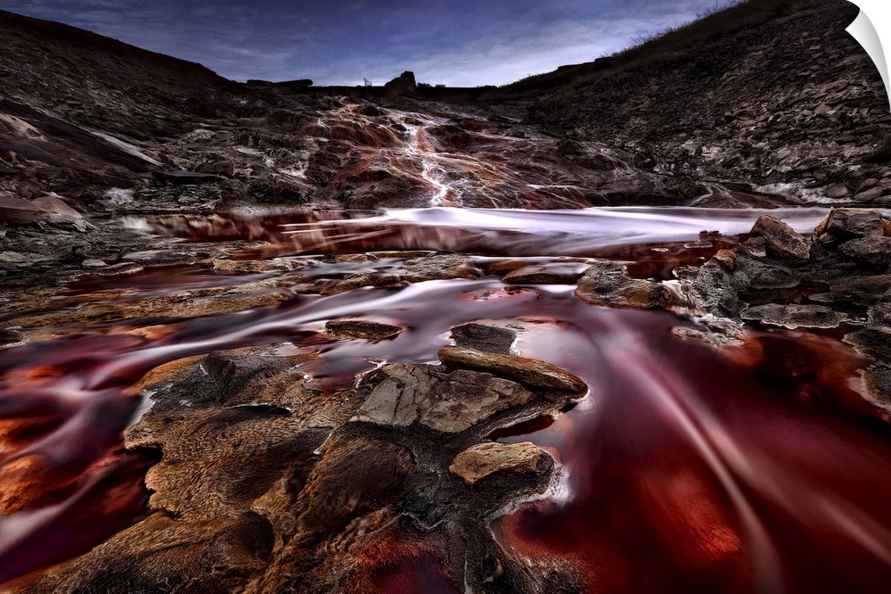 <p>A red river flows through a rock landscape under a crescent moon, Spain.</p>