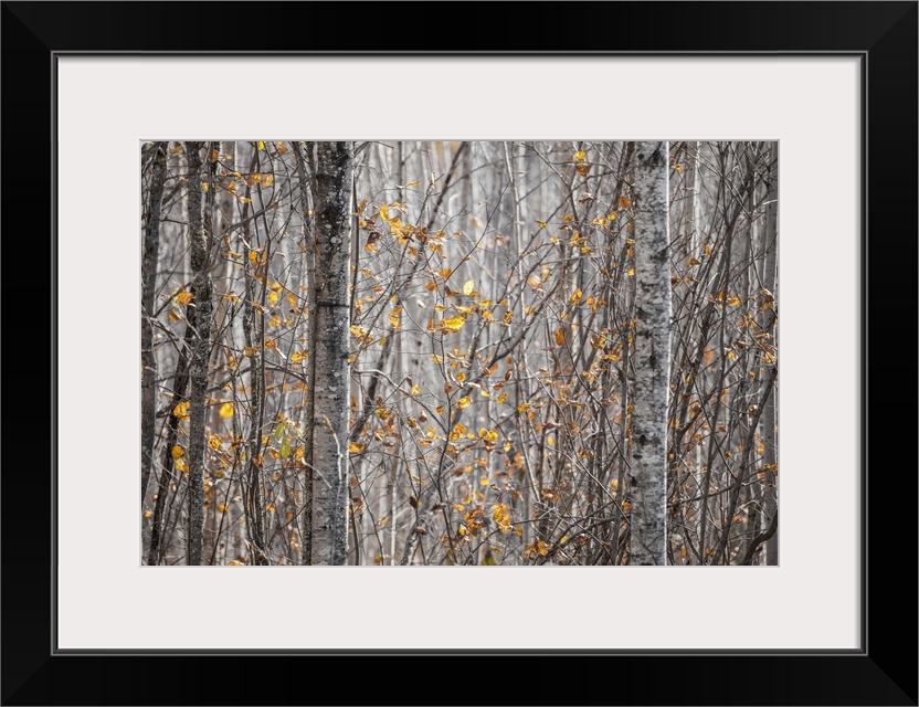 <p>Last of the leaves on the trees in a forest in autumn; Thunder Bay, Ontario, Canada.</p>