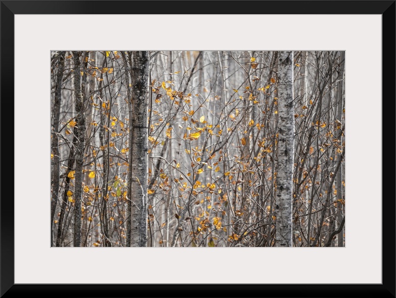 <p>Last of the leaves on the trees in a forest in autumn; Thunder Bay, Ontario, Canada.</p>