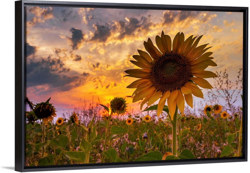 <p>A sunflower with dramatic lighting from the setting sun and a cloudy sky.</p>