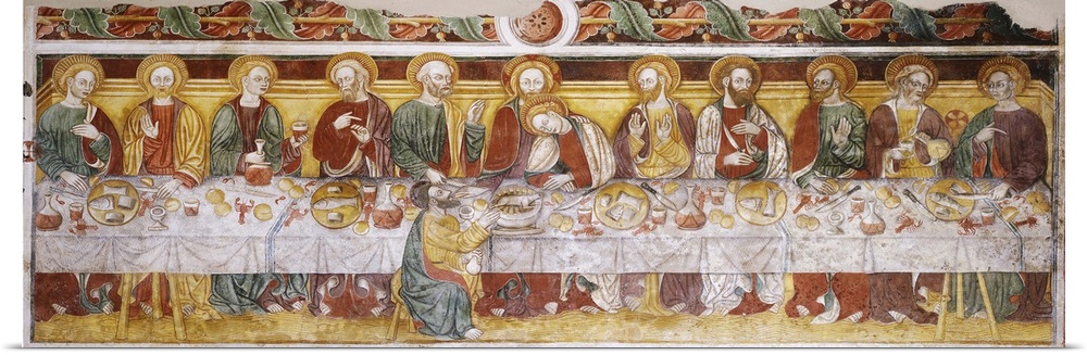 <p>The Last Supper, by Unknown Artist, 15th Century, - Italy, Veneto, Treviso, Treviso, San Polo in Piave, Chiesa del Cimitero. Full image. Jesus Christ Apostles disciples halo table plates bread wine red gold green. (470510) Everett Collection\Mondadori Por</p>