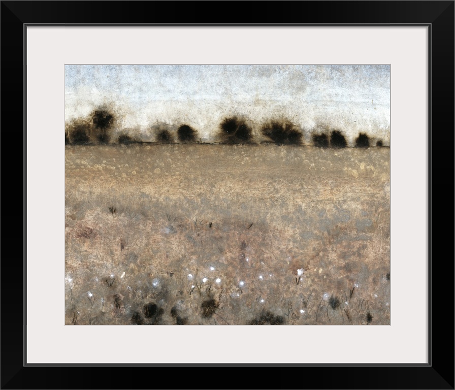 <p>Contemporary painting using dark earth tones to create an open landscape with a line of trees in the distance.</p>