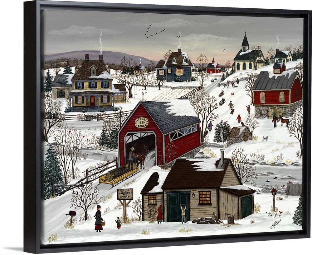 <p>A rural town with barns and a covered bridge in the winter.</p>