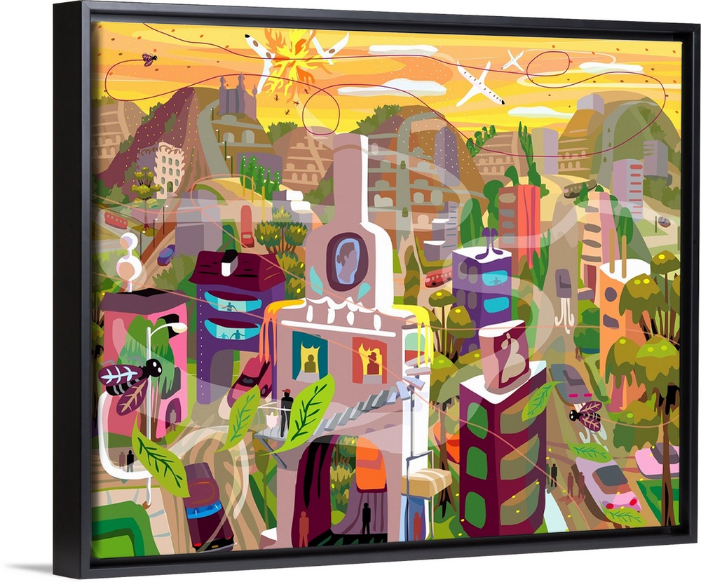 <p>Neo rococo fantasy image of Latin American city with buzzing motion consisting of plancs, flying leaves, mountains, cars, roads, high rise apartment houses and vegetation.</p>