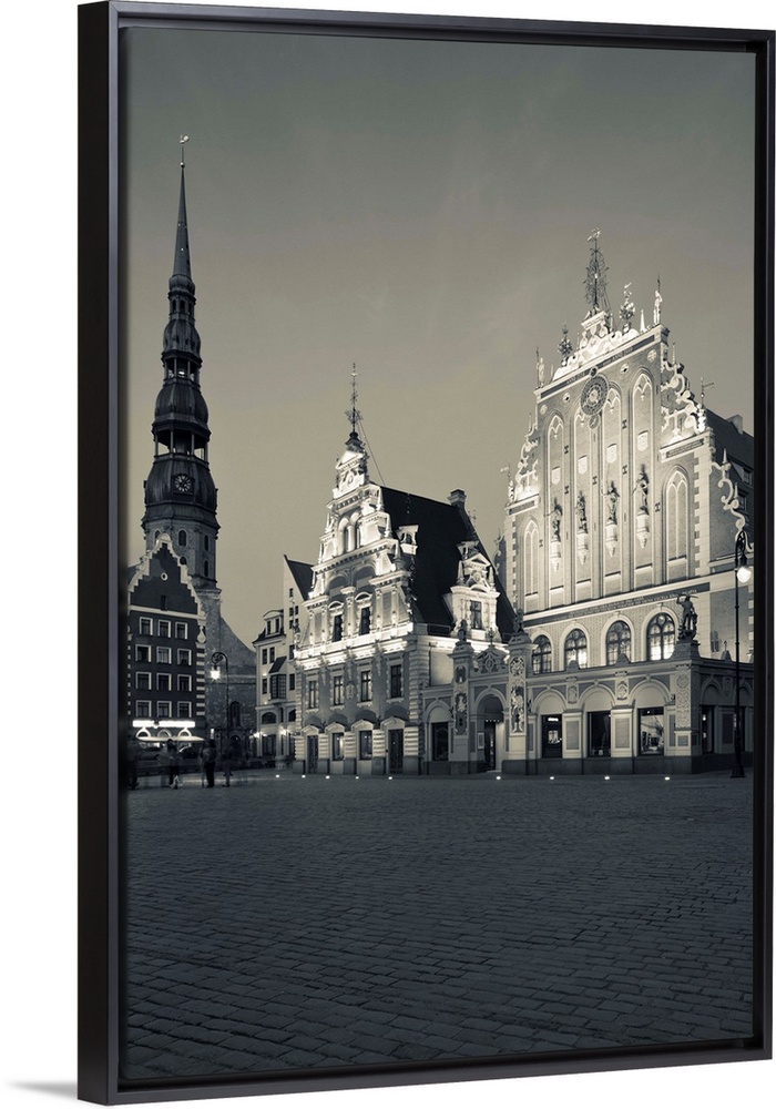 <p>Latvia, Riga, Vecriga, Old Riga, Blackheads' House, b.1344, exterior and St. Peter's Lutheran Church, evening</p>