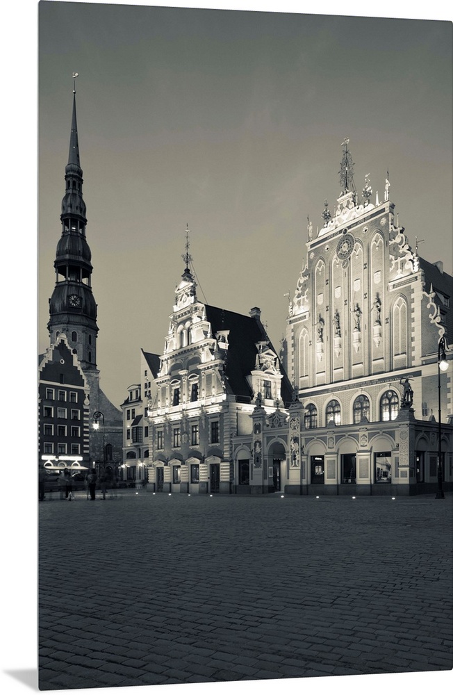 <p>Latvia, Riga, Vecriga, Old Riga, Blackheads' House, b.1344, exterior and St. Peter's Lutheran Church, evening</p>