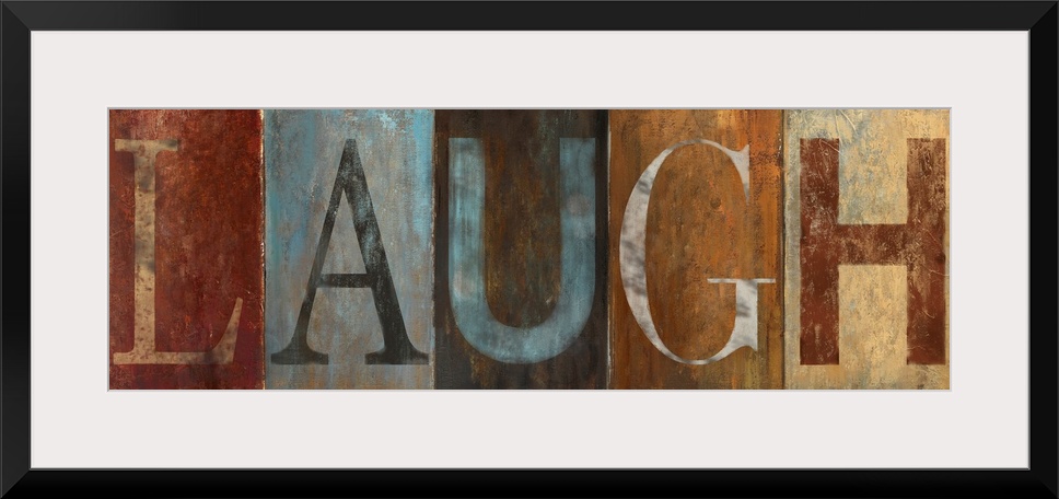 <p>Horizontal home art docor on a big canvas of the word "LAUGH" , each letter is a different color and on a different color background. Image has the appearance of a vintage style painting.</p>