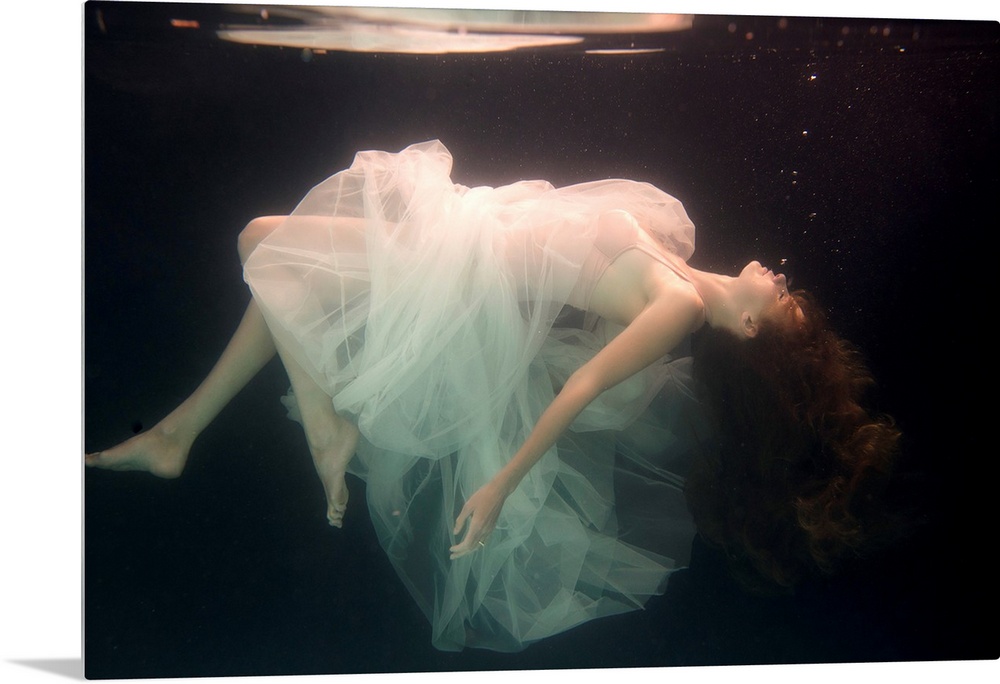 <p>A conceptual photograph of a woman in white dress suspended under water.</p>