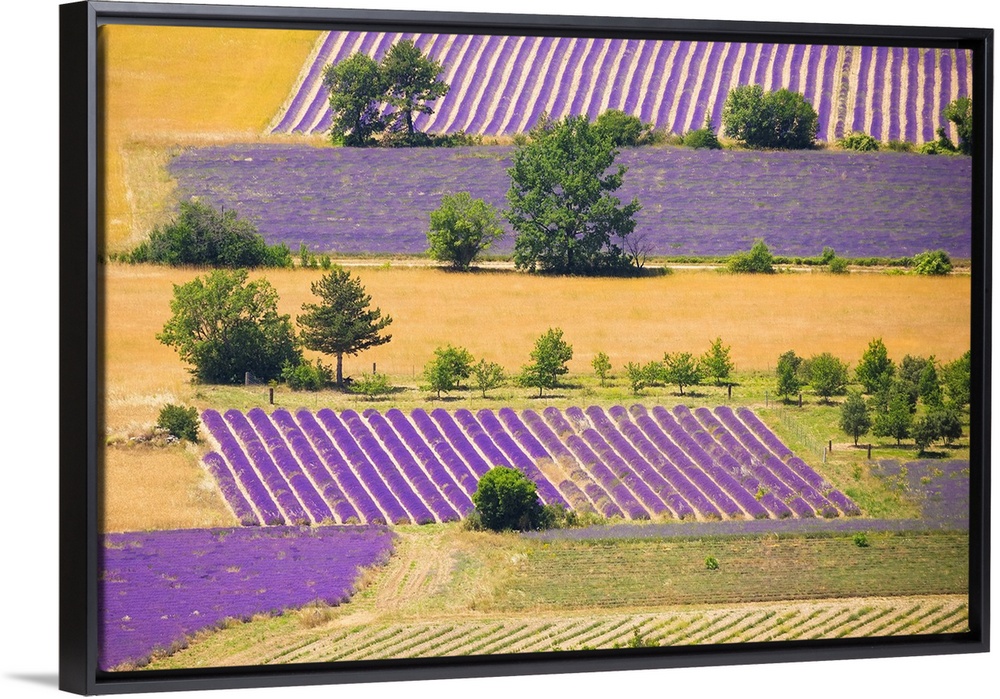 <p>France, Provence, Sault Plateau. Overview of lavender crop patterns and wheat fields. Credit: Jim Nilsen</p>