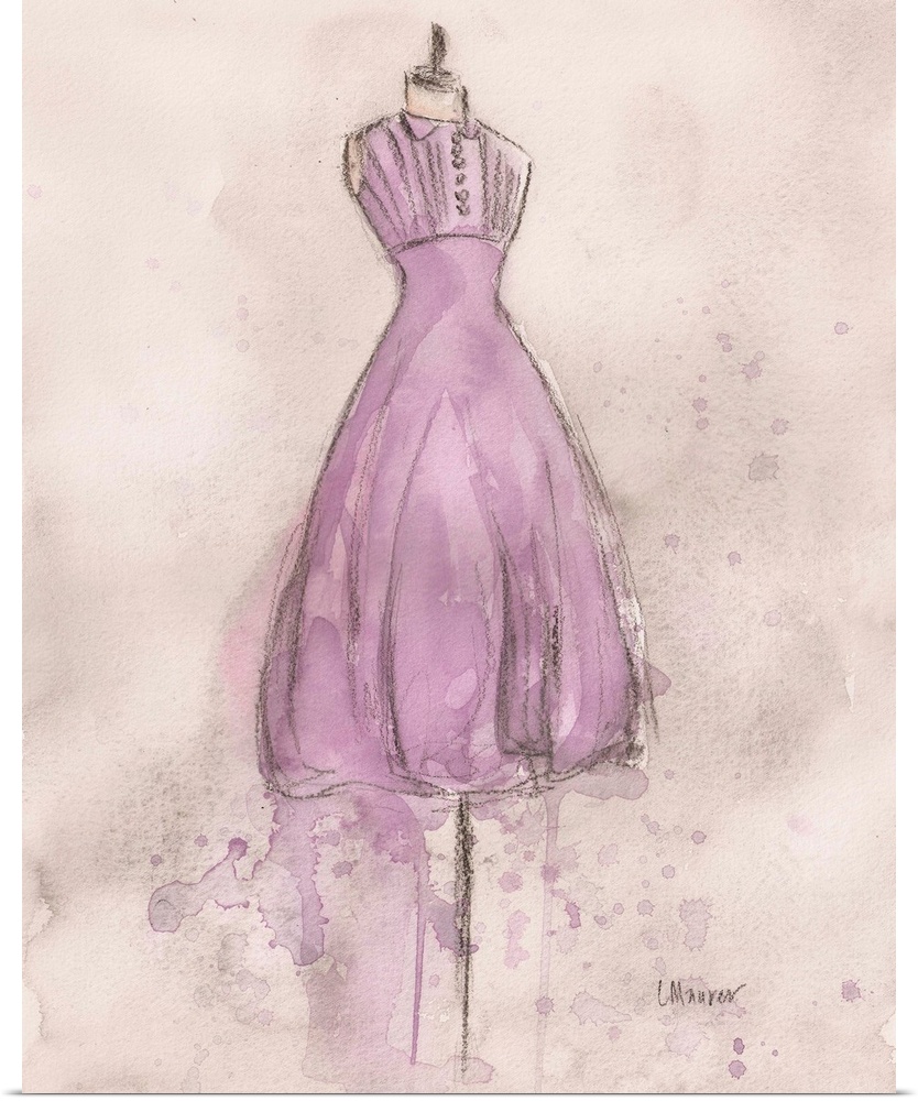 <p>Watercolor painting of a lavender dress on a dress form.</p>