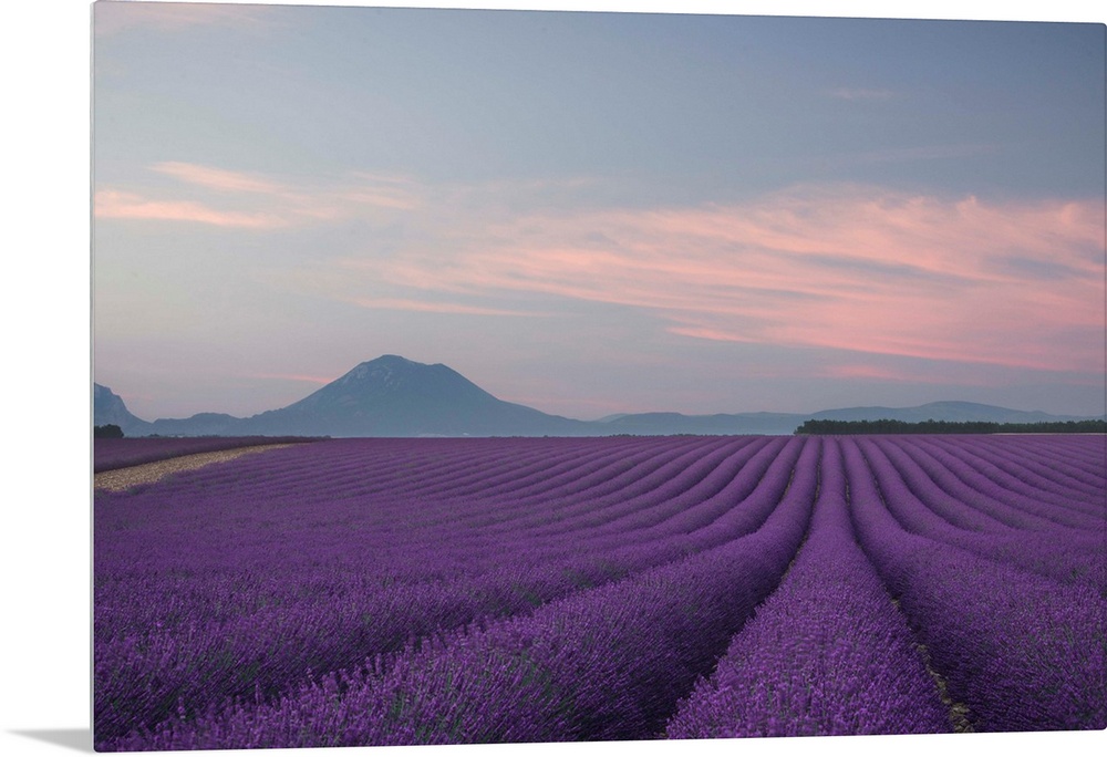 <p>Landscape photograph with a field of rows of lavender and silhouettes of mountains in the background at sunset.</p>
