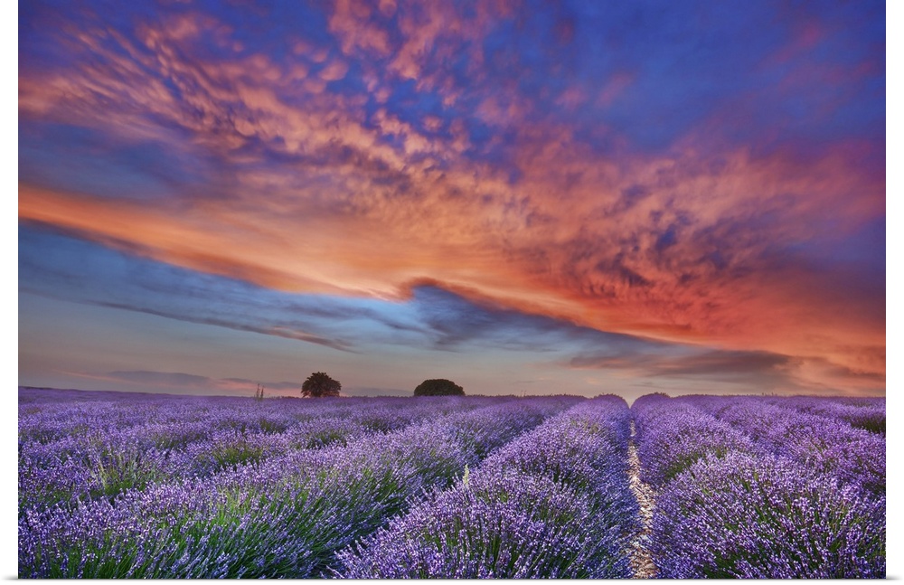 <p>Lavender field and burning clouds. France, Provence-Alpes-Cote d'Azur, Alpes de Haute Provence, Forcalquier, Valensole, Valensole. Allemagne. Provence, Plateau de Valensole. Provence, Western Europe, France.</p>