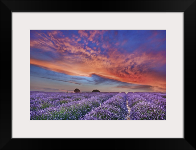 <p>Lavender field and burning clouds. France, Provence-Alpes-Cote d'Azur, Alpes de Haute Provence, Forcalquier, Valensole, Valensole. Allemagne. Provence, Plateau de Valensole. Provence, Western Europe, France.</p>