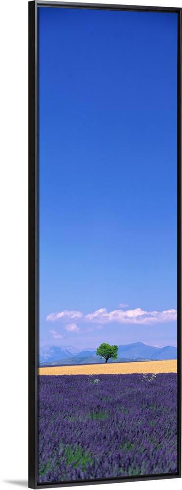 <p>This tall panoramic piece is a photograph of a single tree in the distance with a field full of purple flowers in the foreground.</p>