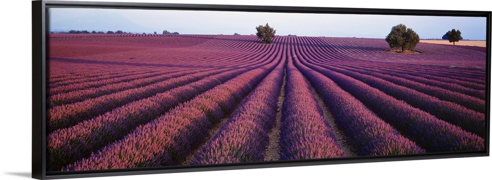 <p>Panoramic photograph of rows of brightly colored blooming lavender flowers in Provence, France.</p>