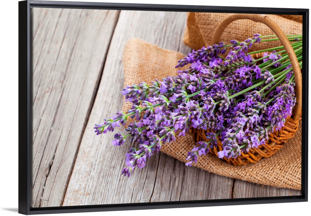 <p>Lavender Flowers In A Basket With Burlap On The Wooden Background.</p>