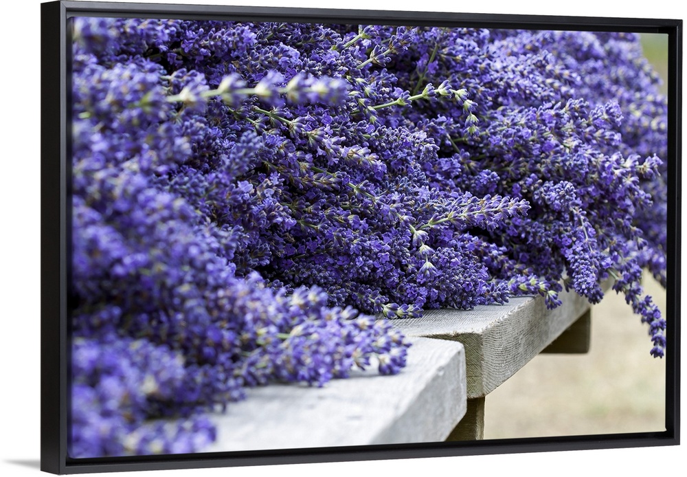 <p>Oversized close up horizontal photograph of a large bunch of lavender lying on a stone surface after it has been harvested.</p>