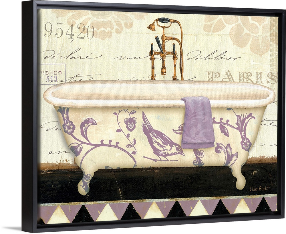 <p>Contemporary artwork of a floral decorated bathtub, against a floral and text background.</p>