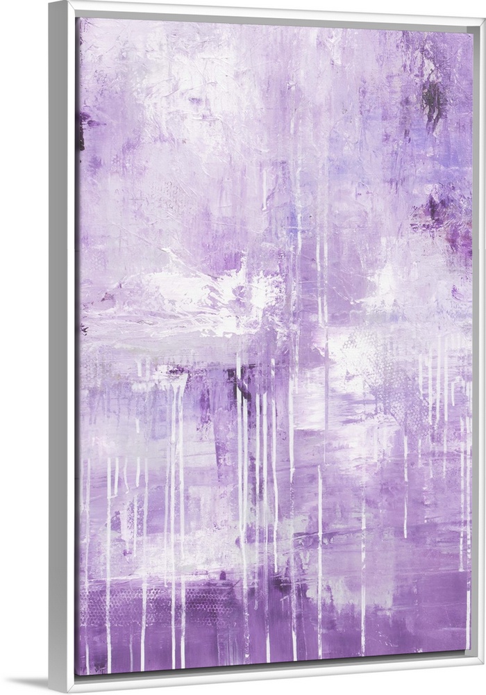 <p>A contemporary abstract painting made up of mostly lavender mixed with darker shades of purple and soft white overlays with leading lines that drip to the bottom creating layers of texture.</p>