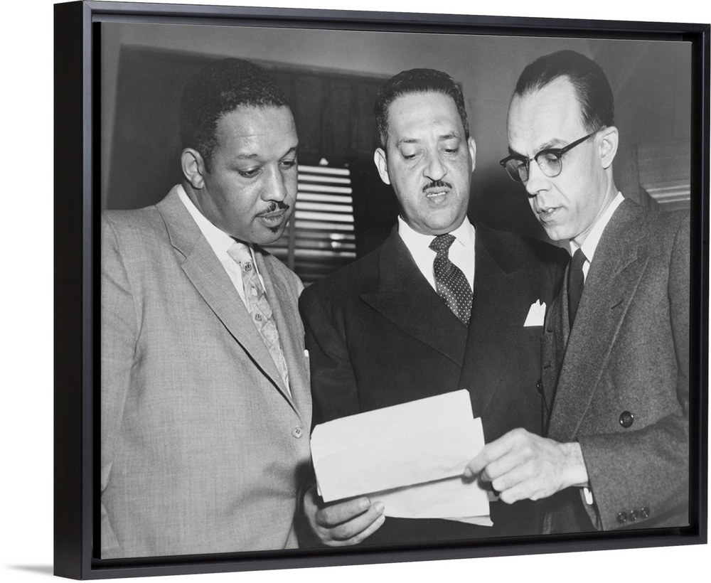 <p>Lawyers confer at the Supreme Court prior to presenting arguments against school segregation. Harold Boulware, Thurgood Marshall, and Spottswood Robinson were the lead lawyers in the historical Brown v. Board of Education case. Dec. 7-8, 1953.</p>