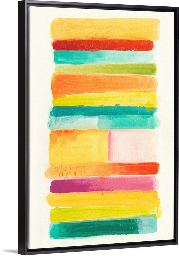 <p>An abstract painting of rectangular shapes in vibrant colors stacked to create one big rectangle.</p>