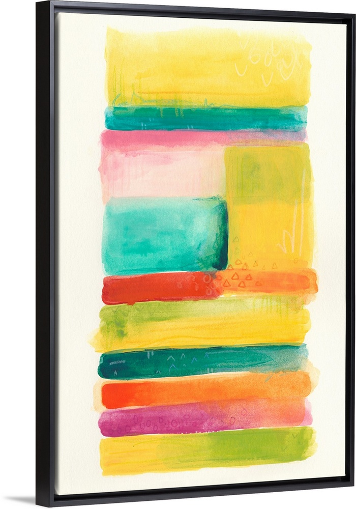 <p>An abstract painting of rectangular shapes in vibrant colors stacked to create one big rectangle.</p>