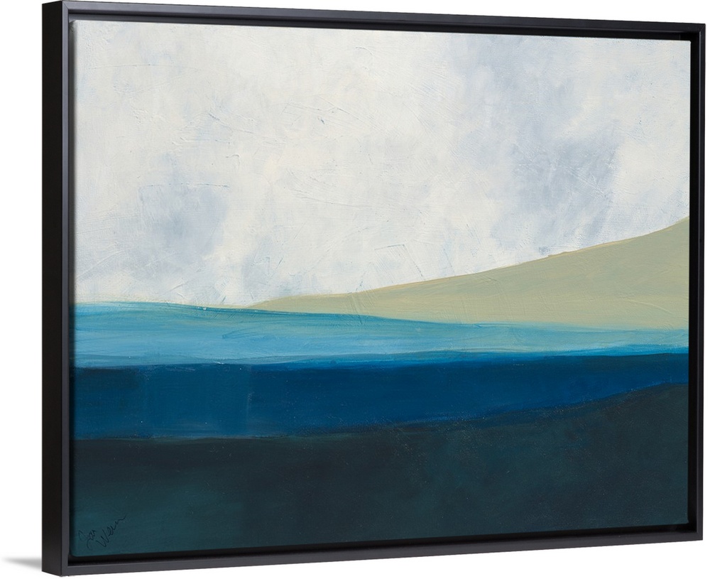 <p>A contemporary abstract painting with blue, white, and tan hues layered on top of each other.</p>