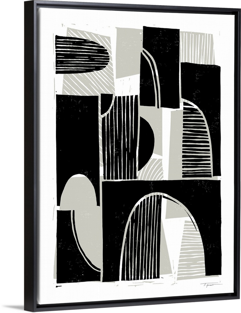 <p>Modern abstract block print with taupe background shapes and black foreground shapes.</p>