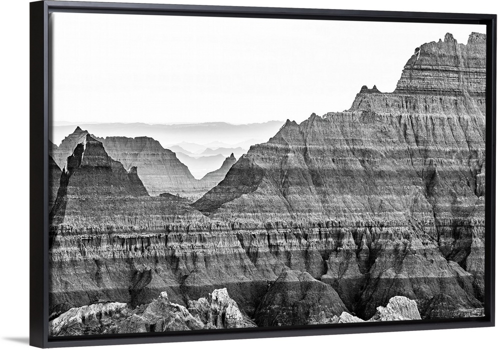 <p>The wonderful layers of South Dakota's Badlands National Park fade into the distant haze. This gorgeous black-and-white photo is available for purchase as satin fine-art paper prints, satin metal prints, canvas gallery wraps and acrylic prints.</p>