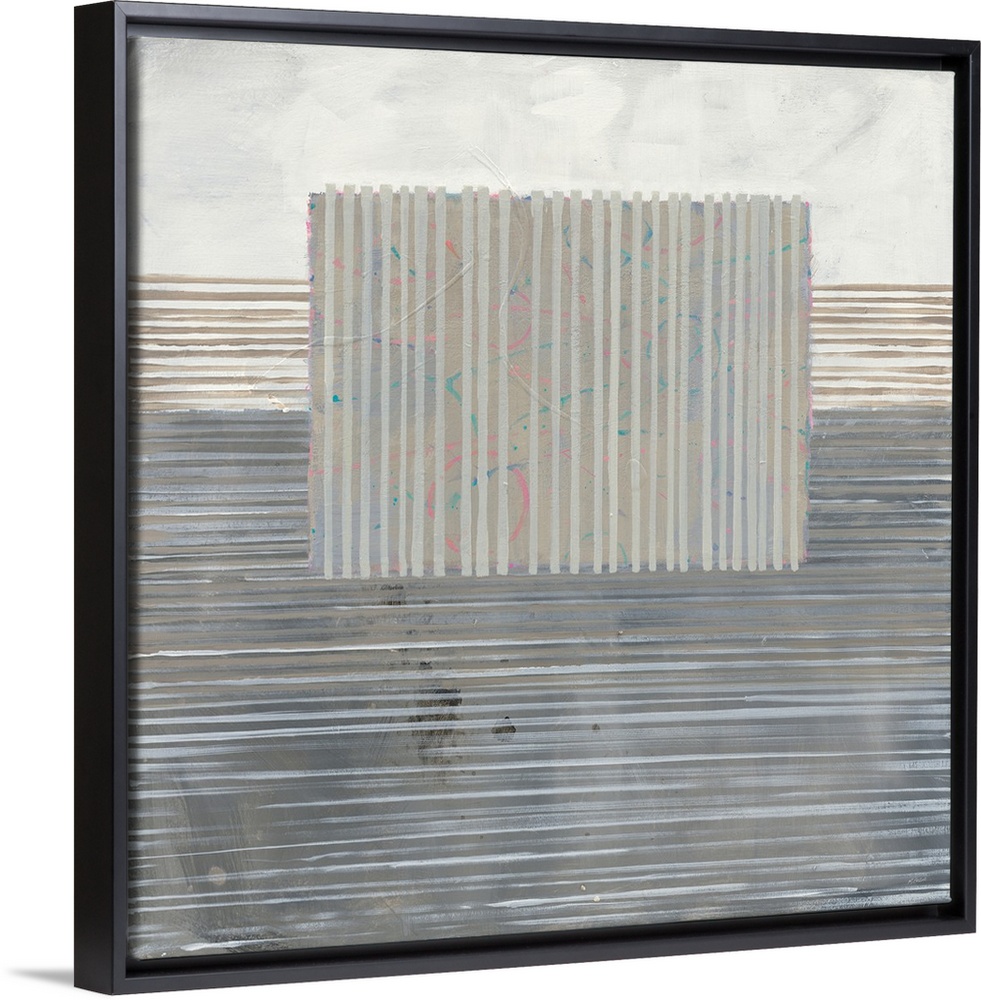 <p>Square abstract painting in neutral colors with thin horizontal lines on the background and short vertical lines in the shape of a rectangle on top with soft pink and blue designs.</p>