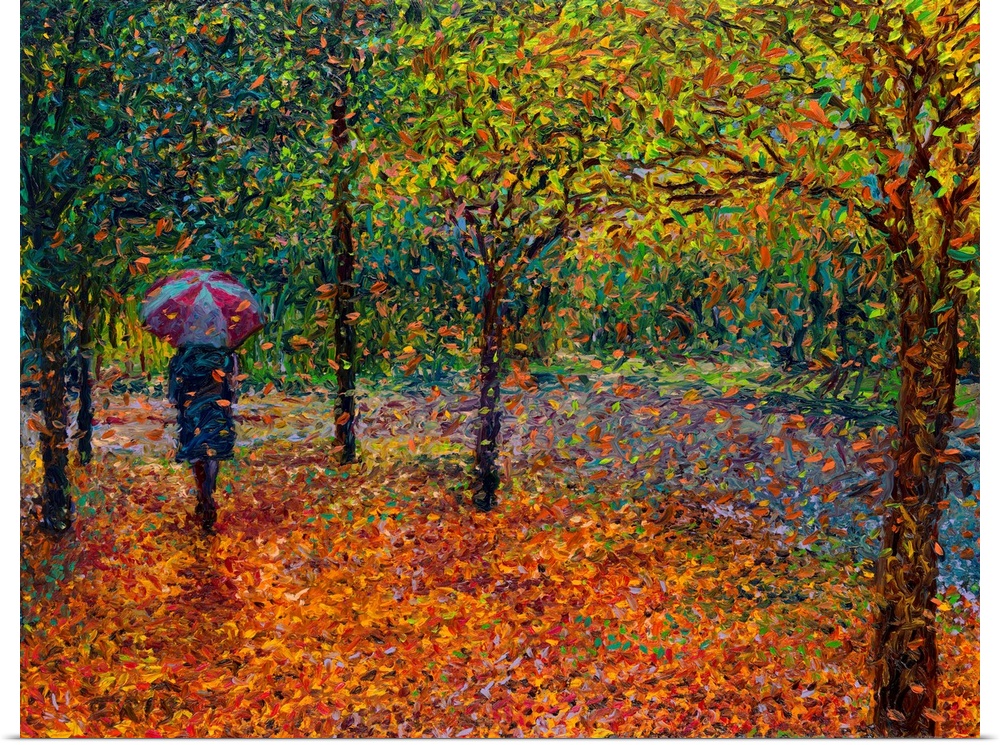 <p>Brightly colored contemporary artwork of a woman taking a walk in the fall.</p>