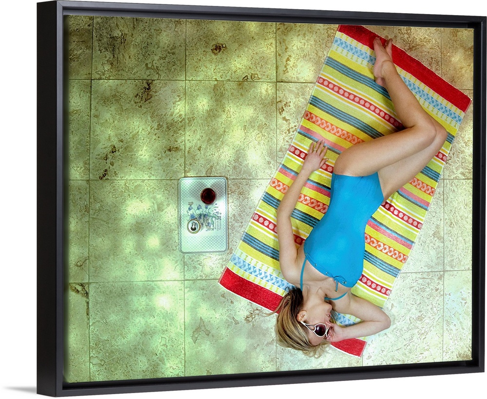 <p>A portrait of a woman wearing a blue bathing suit and lounging by a swimming pool.</p>