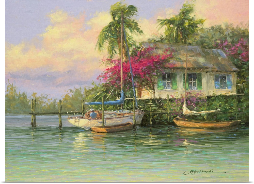 Architecture Cottages Art Contemporary Art Martin Figlinski Landscapes Beaches Seascapes Trees Palm Painting Transportation Boat