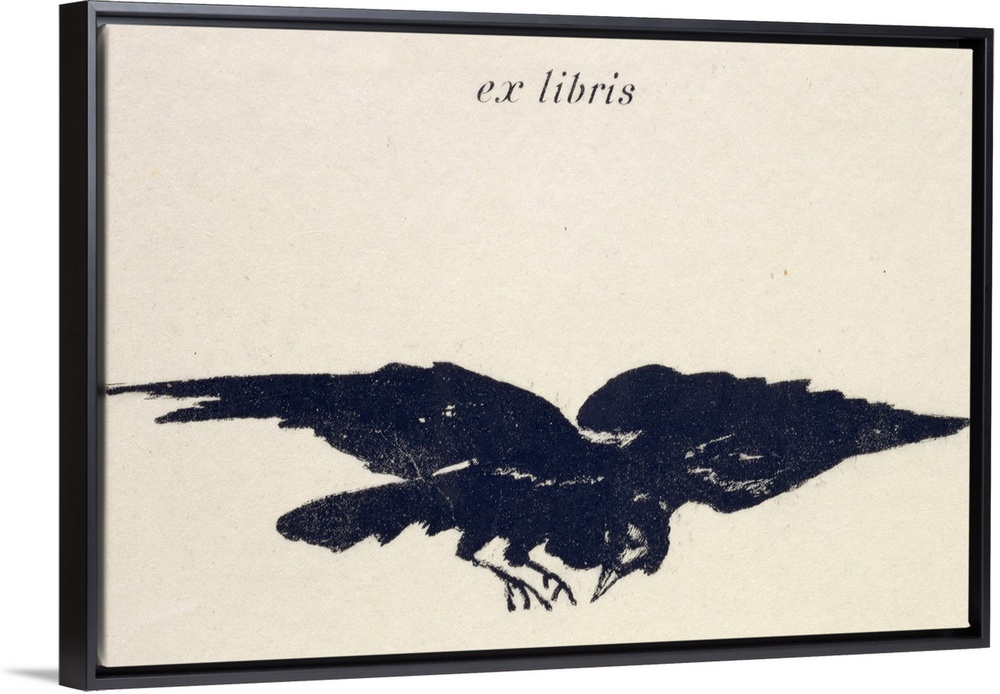 <p>Large, horizontal artwork of an illustrated raven flying on a light, neutral background. Text at the top reads "ex libris", which is Latin for "from the books".</p>