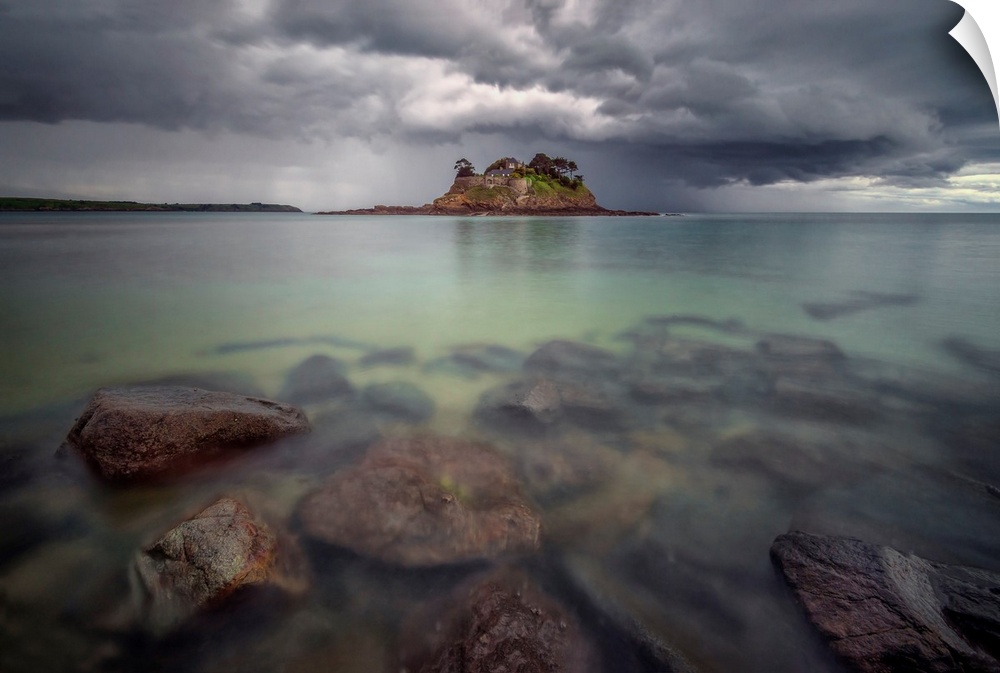 <p>Long time exposure of the shorecoast of Ile du Guesclin island and castle in Brittany, a view at high tide with rocks at first plan and stormy sky on the background.</p>