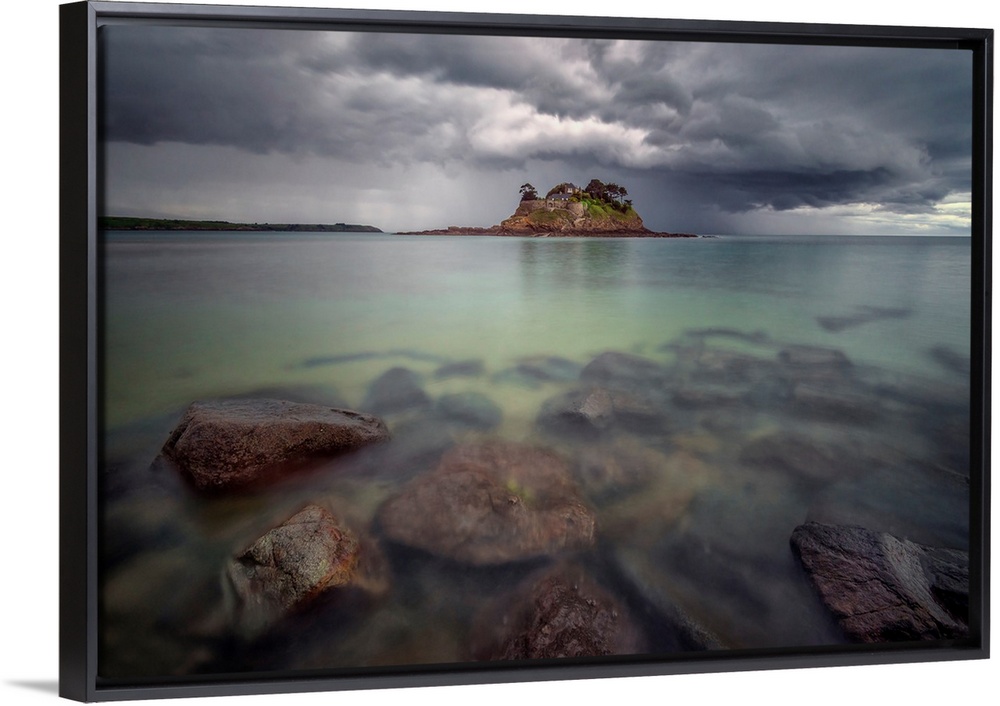 <p>Long time exposure of the shorecoast of Ile du Guesclin island and castle in Brittany, a view at high tide with rocks at first plan and stormy sky on the background.</p>