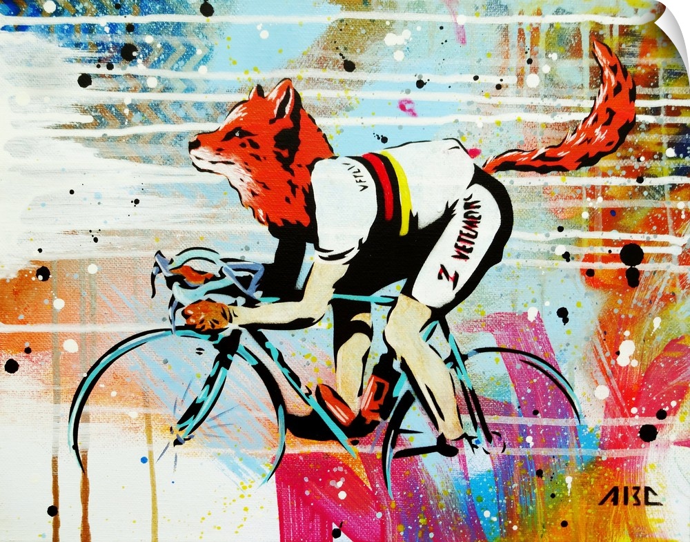 <p>Colorful illustration of a fox on a racing bicycle.</p>