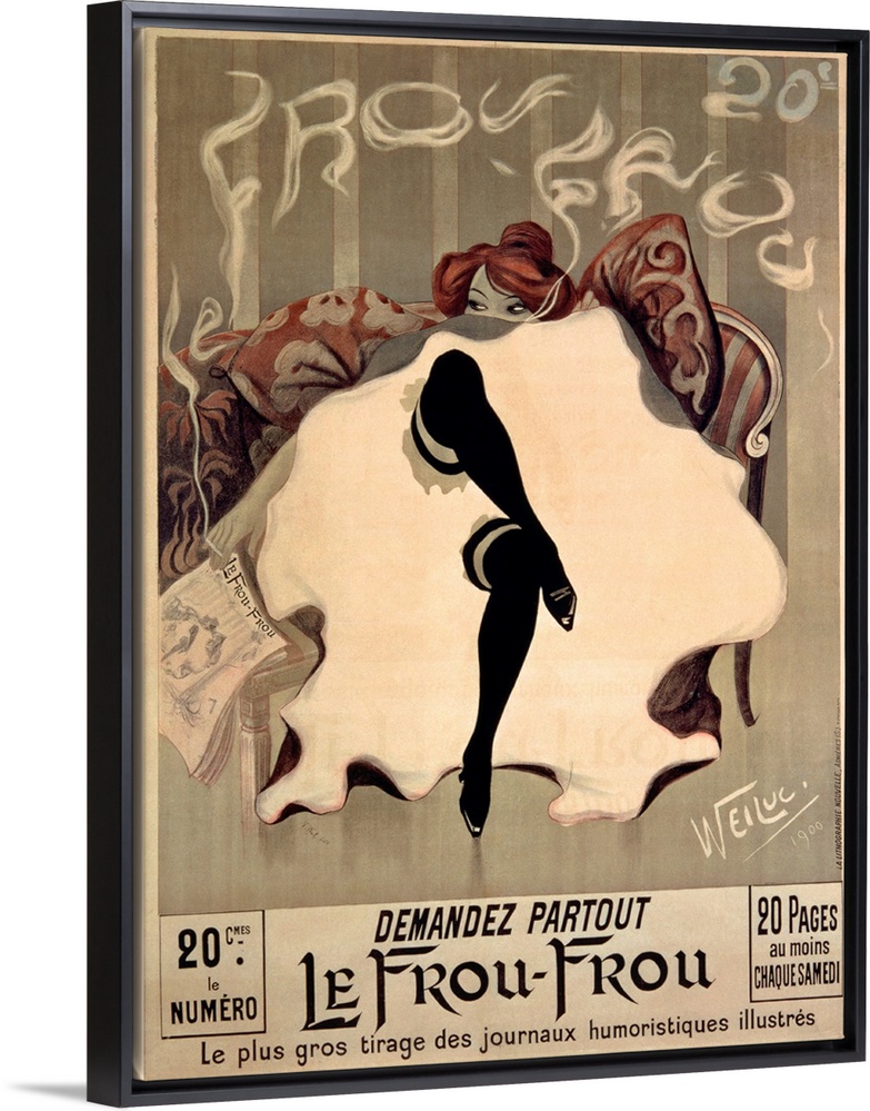 <p>Large antique advertising art for a weekly humorous publication displays a woman in an elaborate dress sitting on a chair smoking a cigarette. Text describing the French publication can be seen towards the bottom of this advertisement.</p>
