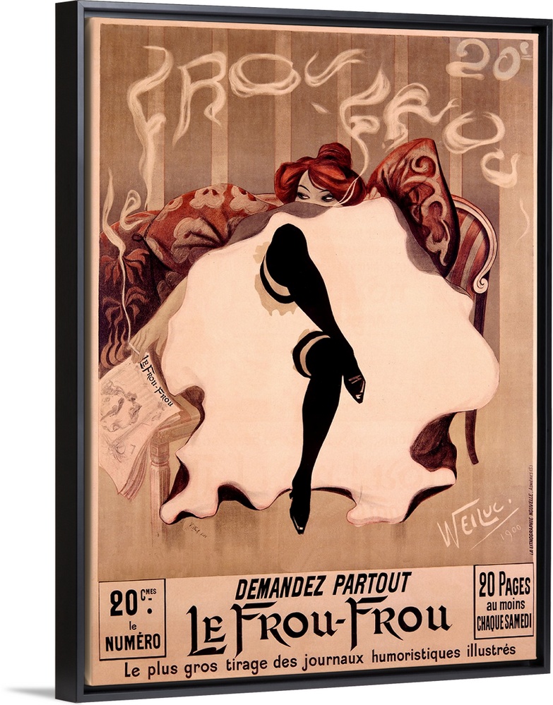 <p>A classic poster with a woman sitting on a couch with her legs crossed and the layers of her dress shown covering her body and most of her face.</p>