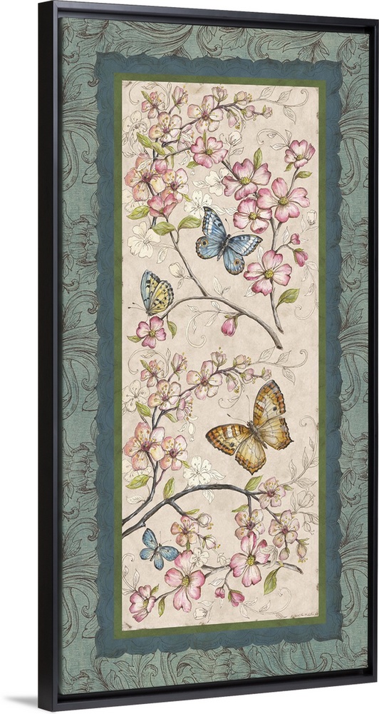 <p>Decorative panel painting of cherry blossom flowers and butterflies with decorative blue and green boarders.</p>