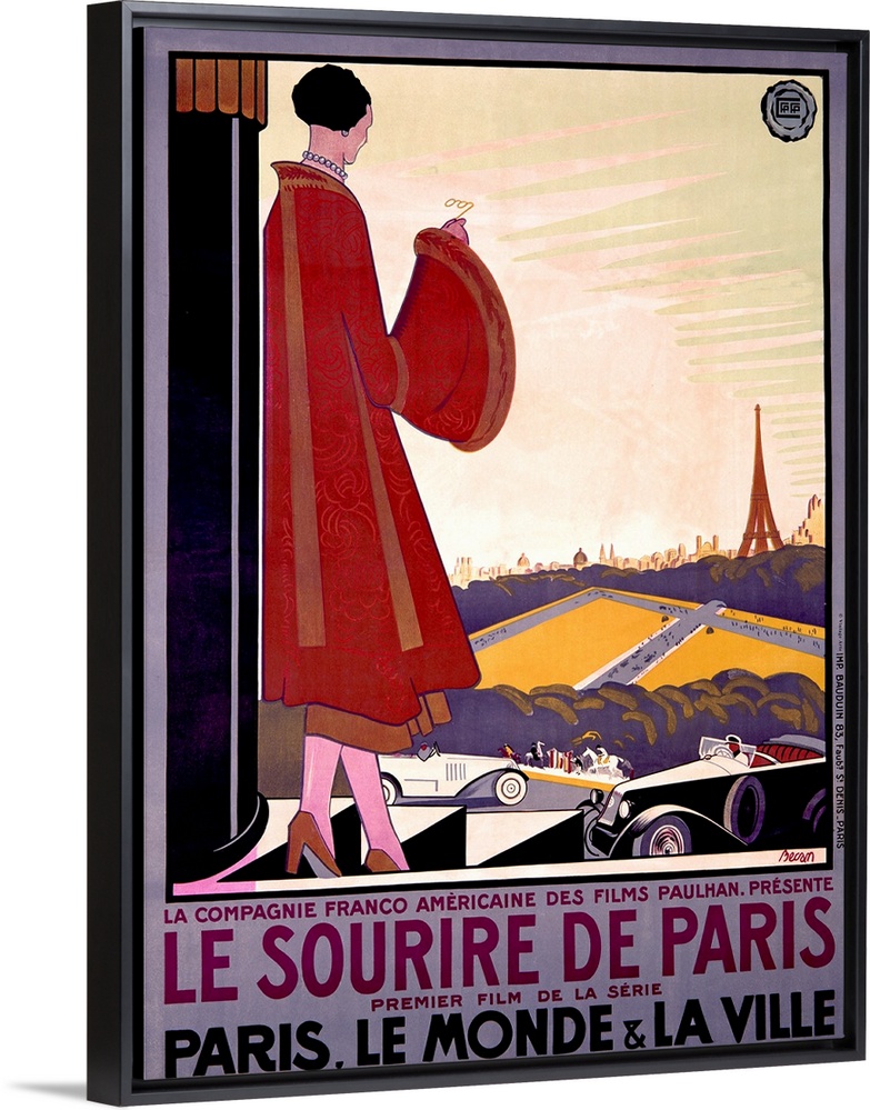 <p>Big, vertical, vintage advertisement for the French film Le Sourire de Paris, a woman in an extravagant coat leans against a pillar as she looks down at vehicles outside of a building, the city of Paris and the Eiffel Tower in the background. Movie text is at the bottom of the image.</p>