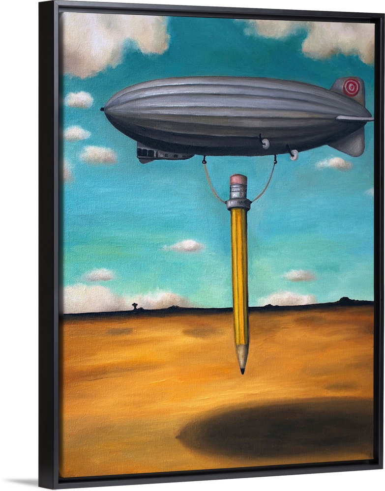 <p>Surrealist painting of a zeppelin carrying a pencil above an arid desert landscape.</p>