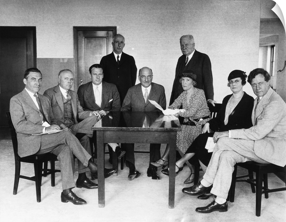 <p>Leaders of Anti-Prohibition Organizations met in the Empire State Building in NYC, June 6, 1932. They want a wet plank to end Prohibition in the Republican Platform during the Chicago convention. L-R: Frank Boland, American Hotel Assn.; Henry Johnson, Voluntary Committee of Lawyers; Enos Curtin, Exe. Commander of Crusaders; Henry Curran, Capt. W.H. Stayton, both of the Assn. Against the Prohibition Amendment; Mrs. Charles Sabin, Mrs. Courtland Nicell, both of Women's Organization for National Prohibition Reform; and Raymond Pitcairn, Vice Chairman Republican Citizens Committee Against National Prohibition.</p>