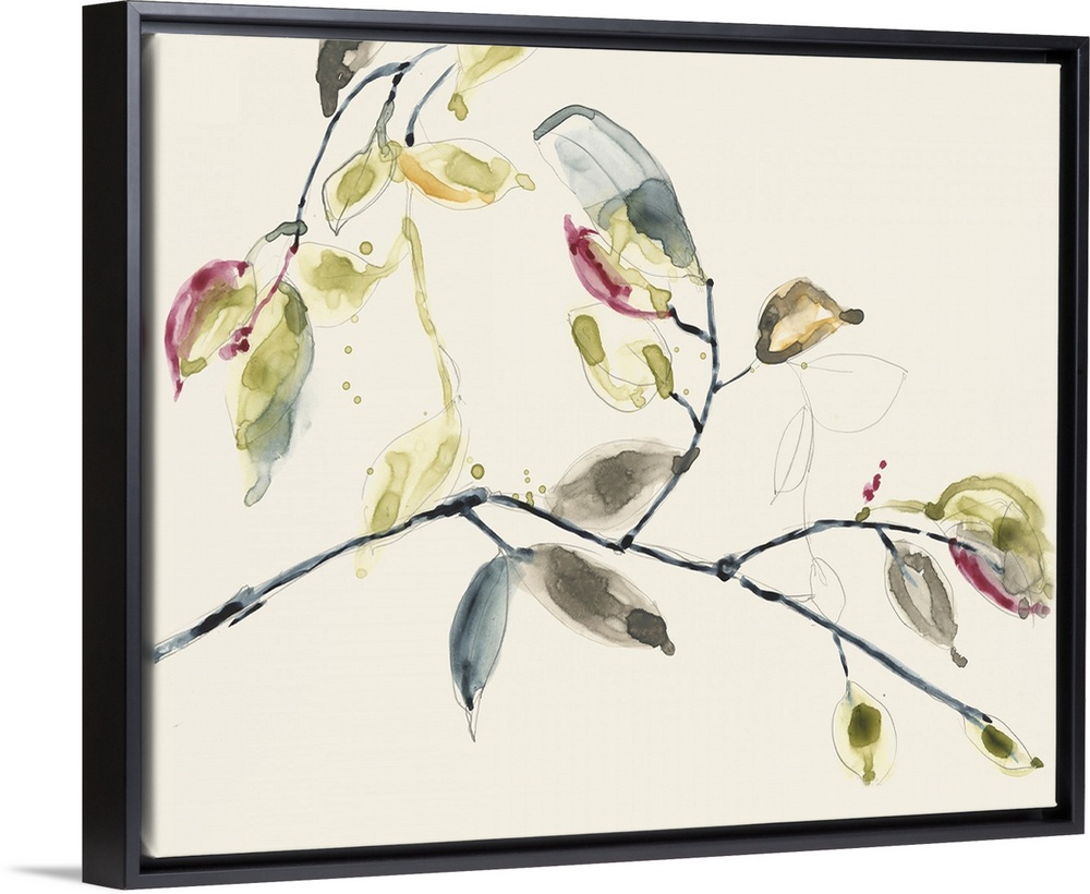 <p>Carefree brush strokes and paint droplets flow over a sketched branch with leaves in this relaxed contemporary artwork.</p>