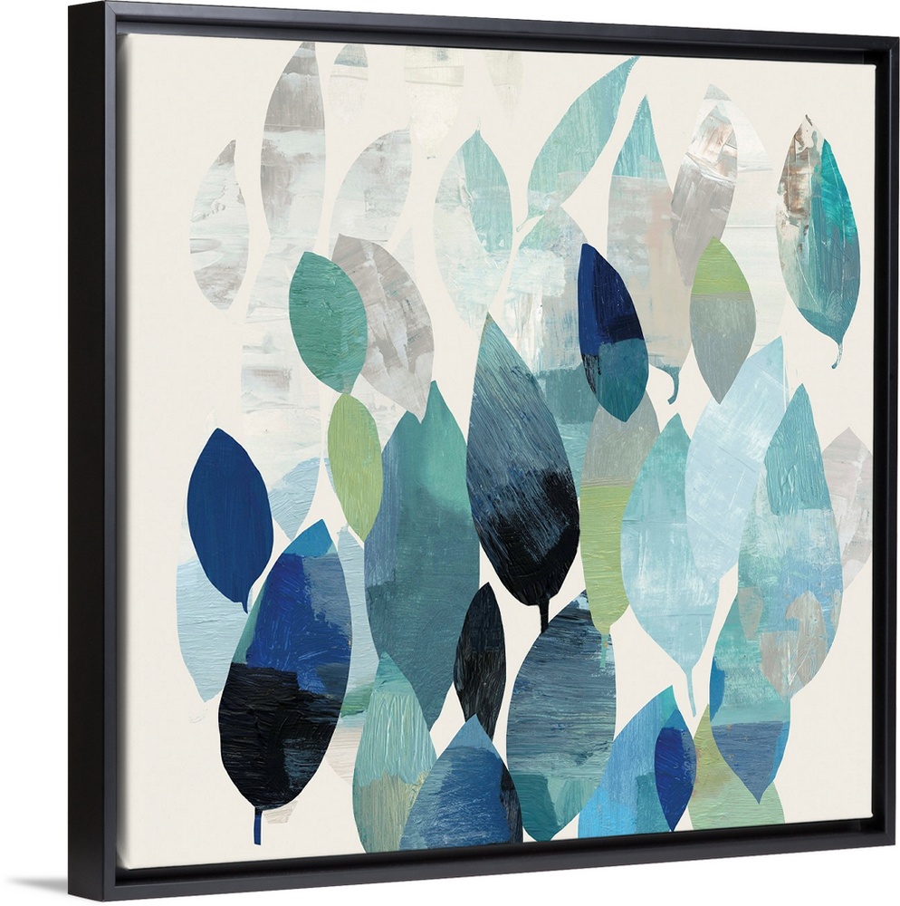 <p>Square abstract painting of leaves in shades of blue.</p>