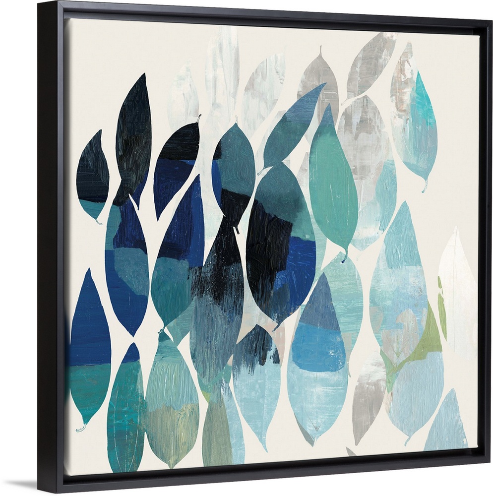 <p>Square abstract painting of leaves in shades of blue.</p>