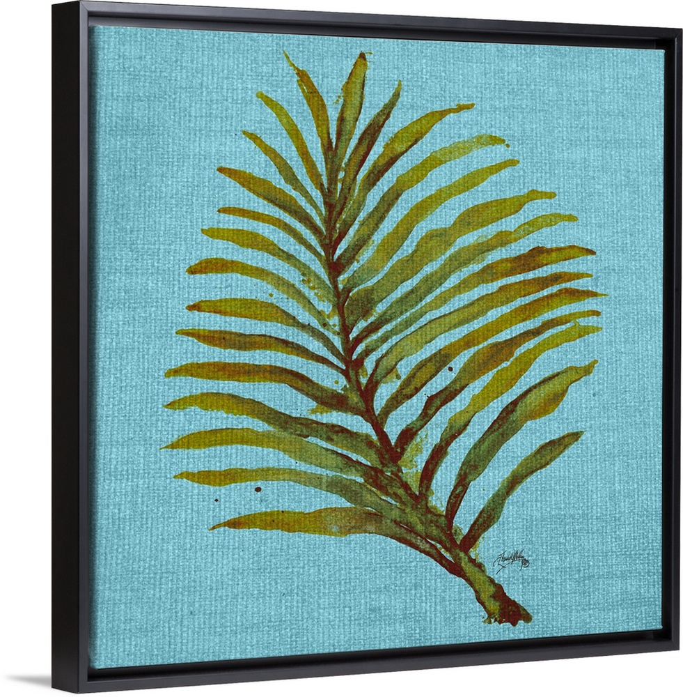 <p>Square watercolor painting of a green palm leaf on a light blue burlap background.</p>