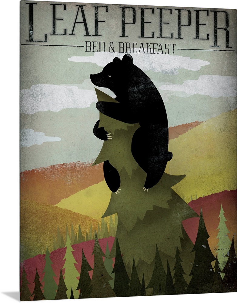 <p>Portrait artwork on a large canvas of a black bear hanging onto the top of a tall pine tree, on a background of autumn colored hills and smaller trees below. Text at the top reads "Leaf Peeper Bed & Breakfast".</p>